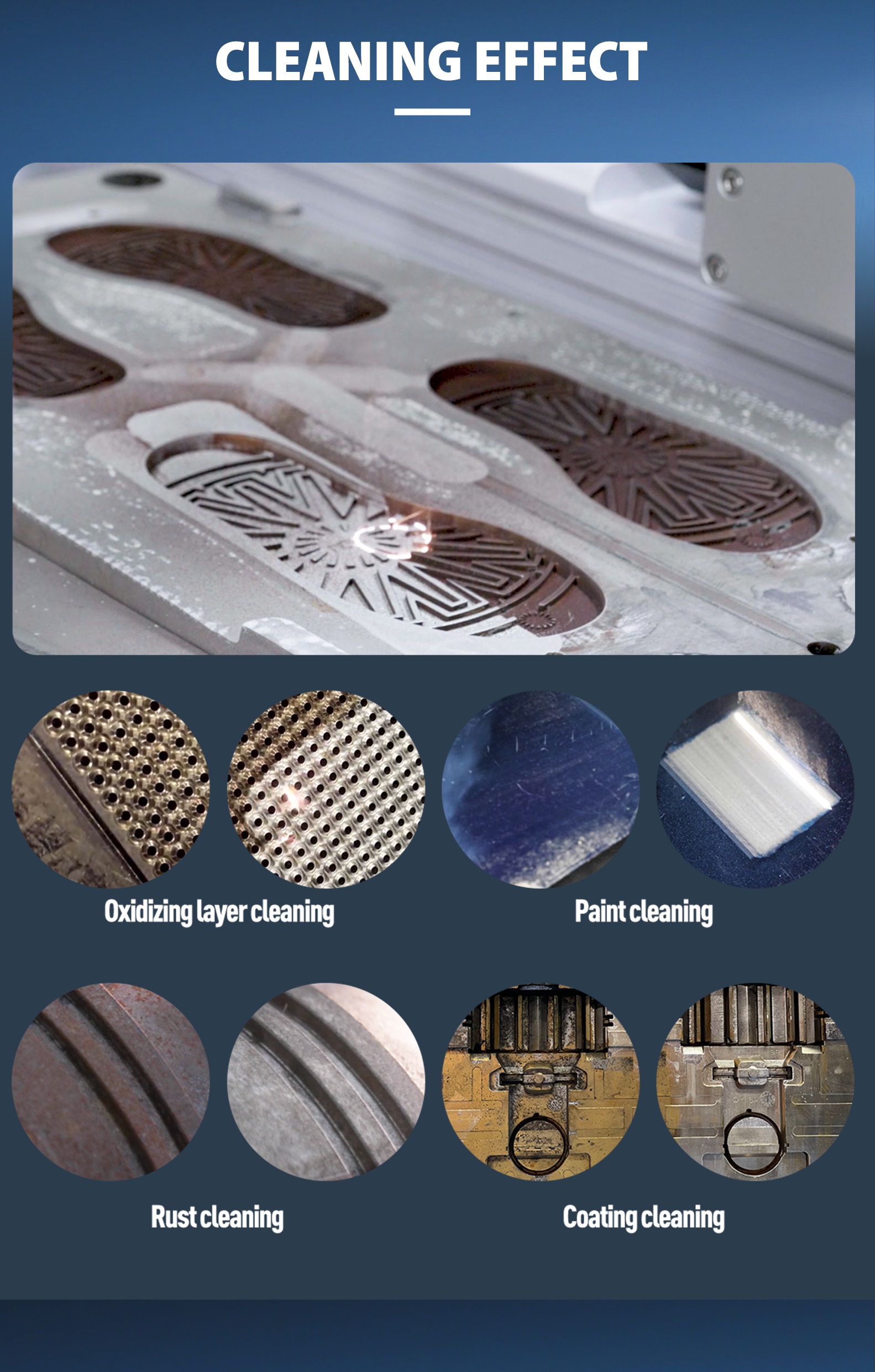 Laser cleaning: Fine cleaning of specific point/area. Bulk cleaning of small parts